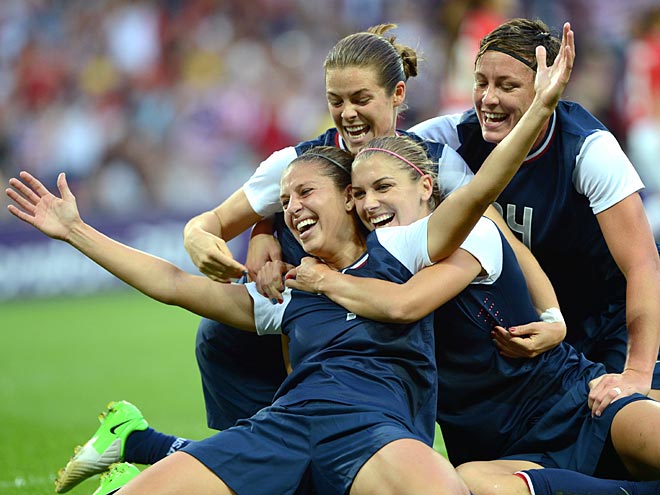 Pop the champagne and cue up the Queen! Members of the U.S. women's soccer team – Carli Lloyd, Kelley O'Hara, Alex Morgan and Abby Wambach – collapse on the grass together to celebrate Lloyd’s gold-medal-winning goal in Thursday's Olympic final against Japan in London.