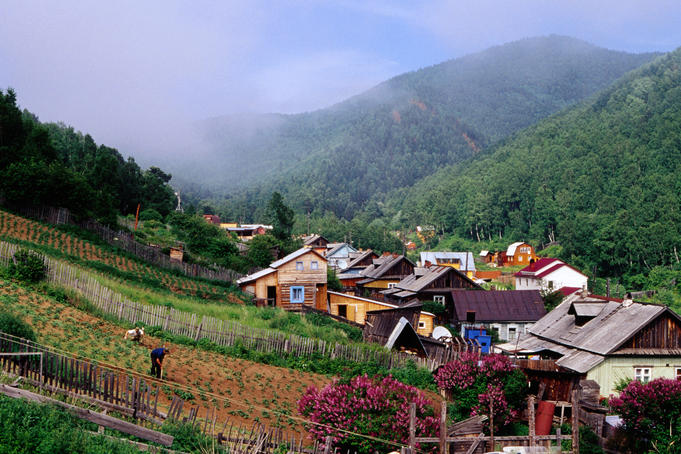 Houses in valley & villagers working in Garden in Listvyanka village on Lake Baikal.